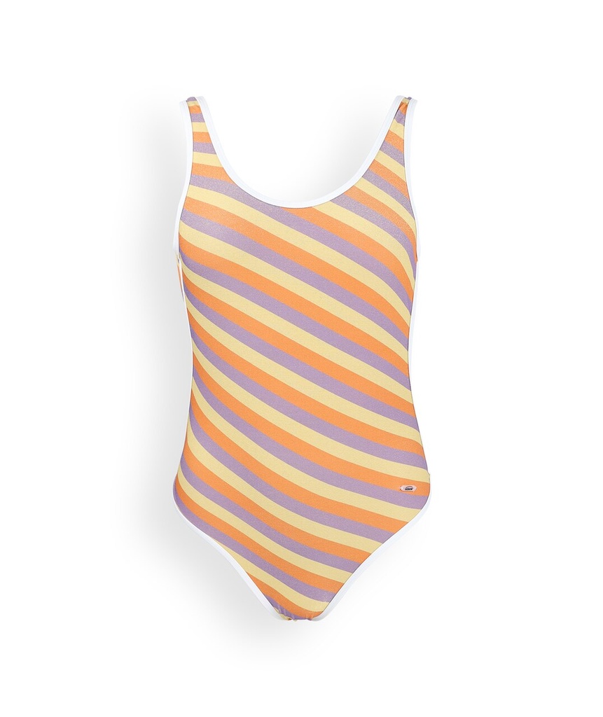 Maillot nageur décolleté devant et dos avec rayures jacquard. finition par un biais. Découpe vintage près du corps. Entièrement doublé. Echancré au niveau des fesses
